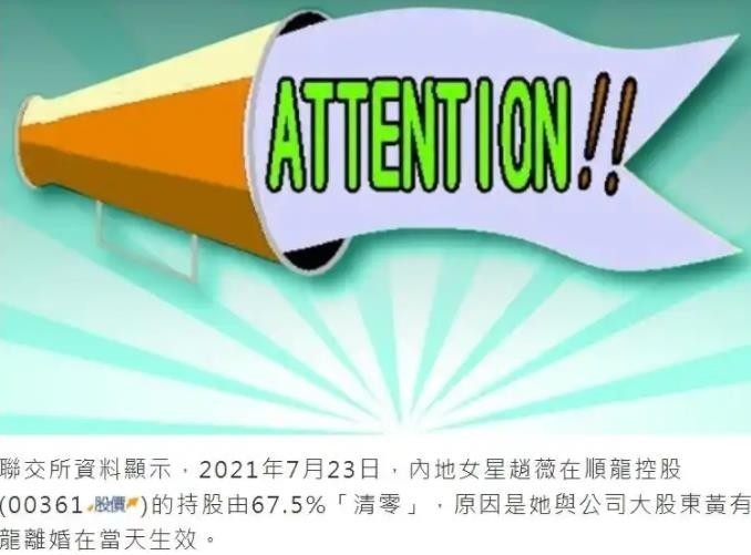 香港联交所近期公布了一项资料,称赵薇在“顺龙控股”67.5%的股份已清零!