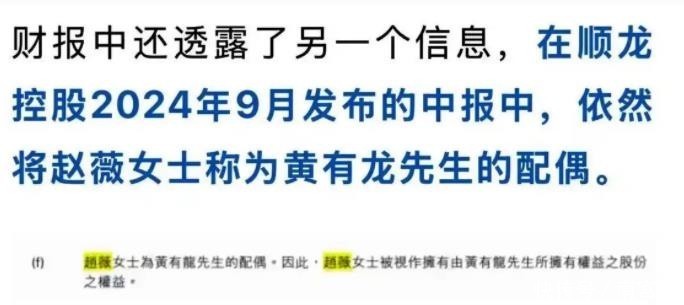 根据媒体爆料,顺龙控股2024年9月的报告中,依然将赵薇称为黄有龙先生的“配偶”。