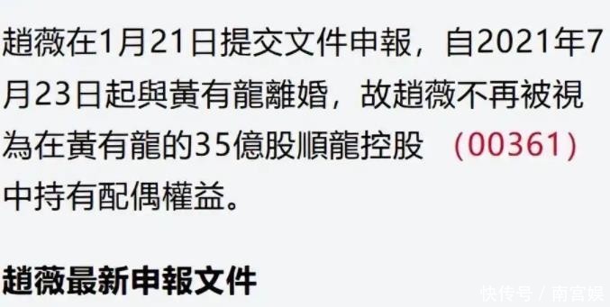 值得一提的是,赵薇在2024年12月28日公布了与黄有龙离婚一事,可联交所曝光的离婚日期则是“2021年7月23日”,相关申报文件还是赵薇主动提交的,日期则是“1月21日”。